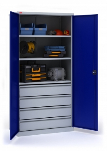 В комплектацию шкафа ИП-1/8 входит: корпус шкафа, двери, 3 полки ИП-1, 4 выдвижных ящика. Шаг перфорации для установки полок 83 мм. Нагрузка на полку - 60 кг, на ящик - 30 кг. Шкаф оборудован ключевым замок повышенной секретности и ригельной системой запирания.