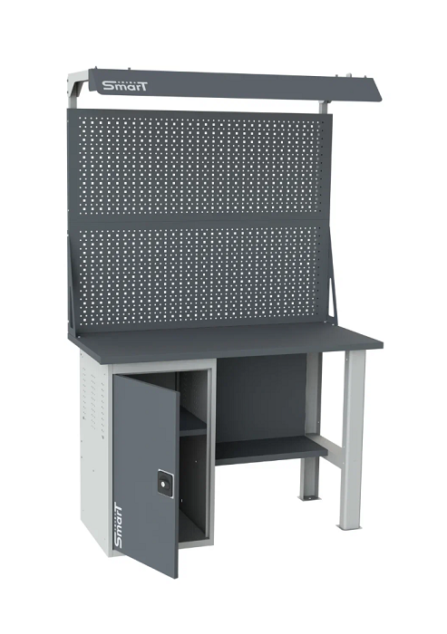 В комплектацию верстака входит: столешница 1280 SMART, полка/стенка 625 SMART, тумба SMART 1, опора SMART, два перфорированных экрана SMART, комплект освещения SMART. Столешница выполнена из фанеры 27 мм со стальной окрашенной накладкой 1,2 мм. Опора сварная выполненная с применением высокоточного сварочного оборудования. Имеет нижнюю перекладину для усиления устойчивости конструкции. Размер опоры (ВхШхГ): 835х500х135 мм. Тумба SMART 1 комплектуется одной дверью и одной полкой. Закрываться ключевым замком с поворотной ручкой. Секретность замка 2000 комбинаций (2 ключа в комплекте). Внутренняя стенка двери имеют универсальную перфорацию для размещения навесных элементов. Шаг квадратной перфорации (10 мм) - 38х38 мм, круглой (7 мм) - 25х38 мм. Возможна смена стороны открывания двери тумбы. Перфорированный экран SMART имеет универсальную перфорацию для размещения различного типа крючков и держателей инструмента. Шаг квадратной перфорации экрана (10 мм) - 38х38 мм, круглой (7 мм) - 25х38 мм. Цвет верстака: опора, корпус тумбы - серый Ral 7035, столешница, полка/стенка, лицевая панель тумбы, экран - графит Ral 7016. Поставляется в разобранном виде.