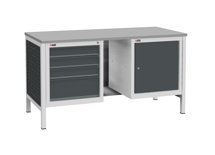 Цвет верстака: серый Ral 7038, панель облицовочная и лицевая панель ящиков/дверей антрацит Ral 7016. Тип покрытия: эпоксидная порошковая краска. Поставляется в разобранном виде