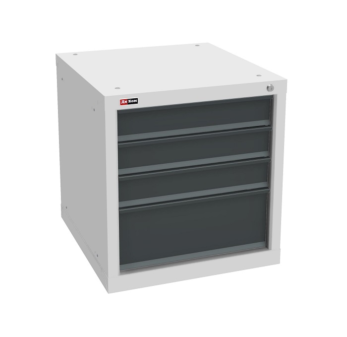 В комплектацию верстака входит: столешница ВЛ-К 150, две опоры ВЛ-К, подвесная тумба ВЛ-К-014, подвесная тумба ВЛ-К-009, три промежуточные панели ВЛ-К, панель облицовочная к опоре ВЛ-К. Столешница выполнена из фанеры (24 мм) с покрытием из оцинкованного листа металла. Тумба ВЛ-К-009 комплектуется полкой и дверью. Тумба ВЛ-К-014 комплектуется 4 выдвижными ящиками. Полезный размер ящиков (ВхШхГ): 1-80х459х459 мм, 2-180х459х459 мм. Тумба закрывается центральным ключевым замком (50 000 циклов). Опора сварная. Размер опоры (ВхШхГ) - 800х40х660 мм. Промежуточная панель устанавливается между двумя опорами и предназначена для придания жесткости верстаку. Одновременно является задней стенкой или нижней полкой. Панель облицовочная перфорированная устанавливается на опору верстака.