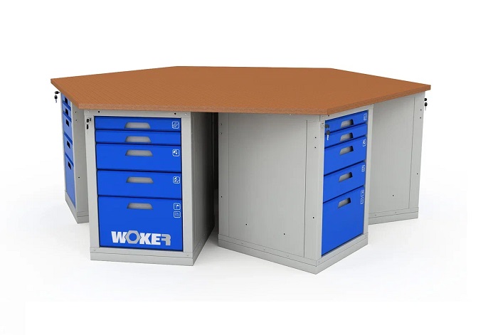 В комплектацию верстака входит: столешница Woker 2500, шесть тумб Woker 05. Столешница выполнена из шлифованной березовой многослойной фанеры толщиной 30 мм. Снаружи фанера обработана влагостойким антисептиком цвета "красное дерево", что придает фанере повышенную влагостойкость и более темный цвет.  Тумба Woker 05 комплектуется 5 выдвижными ящиками (2 высотой - 135 мм, 2 высотой - 65 и 1 высотой - 275 мм). Полезный размер ящика: (ШхГ) 459х612 мм. В ящиках есть противоскользящие коврики и набор наклеек с пиктограммами для маркировки содержимого.