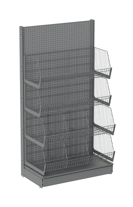 Стеллаж пристенный с корзинами предназначен для оборудования торговых залов и магазинов любых форматов. Относится к основным стеллажам, которые используются в супермаркетах и магазинах самообслуживания. Подходит для продовольственных и непродовольственных товаров. Изготовлен из высококачественной листовой стали с порошковым покрытием, обеспечивающий долговечность и стойкостью. Конструкция стеллажа позволяет одновременно размещать мелкогабаритный товар, с помощью навесных элементов на перфорации, а также товары продающиеся навалом.