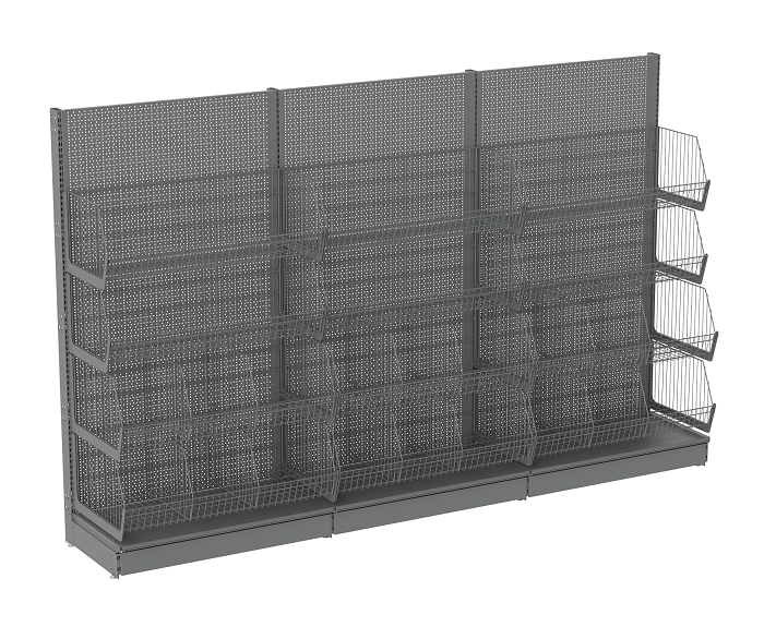 Стеллаж пристенный с корзинами предназначен для оборудования торговых залов и магазинов любых форматов. Относится к основным стеллажам, которые используются в супермаркетах и магазинах самообслуживания. Подходит для продовольственных и непродовольственных товаров. Изготовлен из высококачественной листовой стали с порошковым покрытием, обеспечивающий долговечность и стойкостью. Конструкция стеллажа позволяет одновременно размещать мелкогабаритный товар, с помощью навесных элементов на перфорации, а также товары продающиеся навалом.