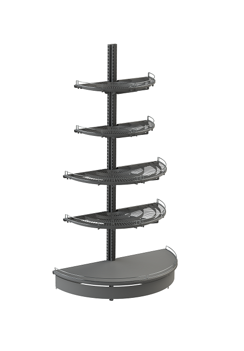 Стеллаж торцевой с полукруглый с сетчатыми полками устанавливается на торец линии островных стеллажей и придает ей законченный вид, а также обеспечивает дополнительное место для выкладки товара. Конструкция торцевого стеллажа формируется на основе последней стойки островного стеллажа (на торце) при помощи наборного адаптера для установки полкодержателей. Не эксплуатируется как отдельно стоящий!